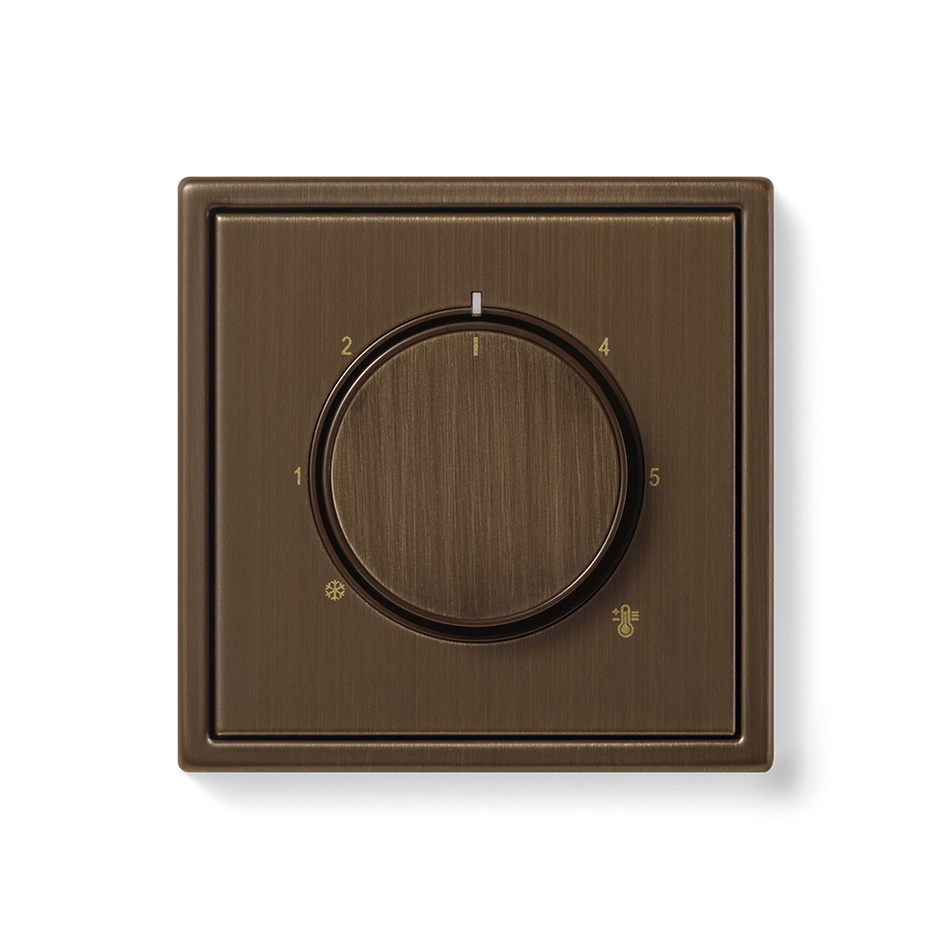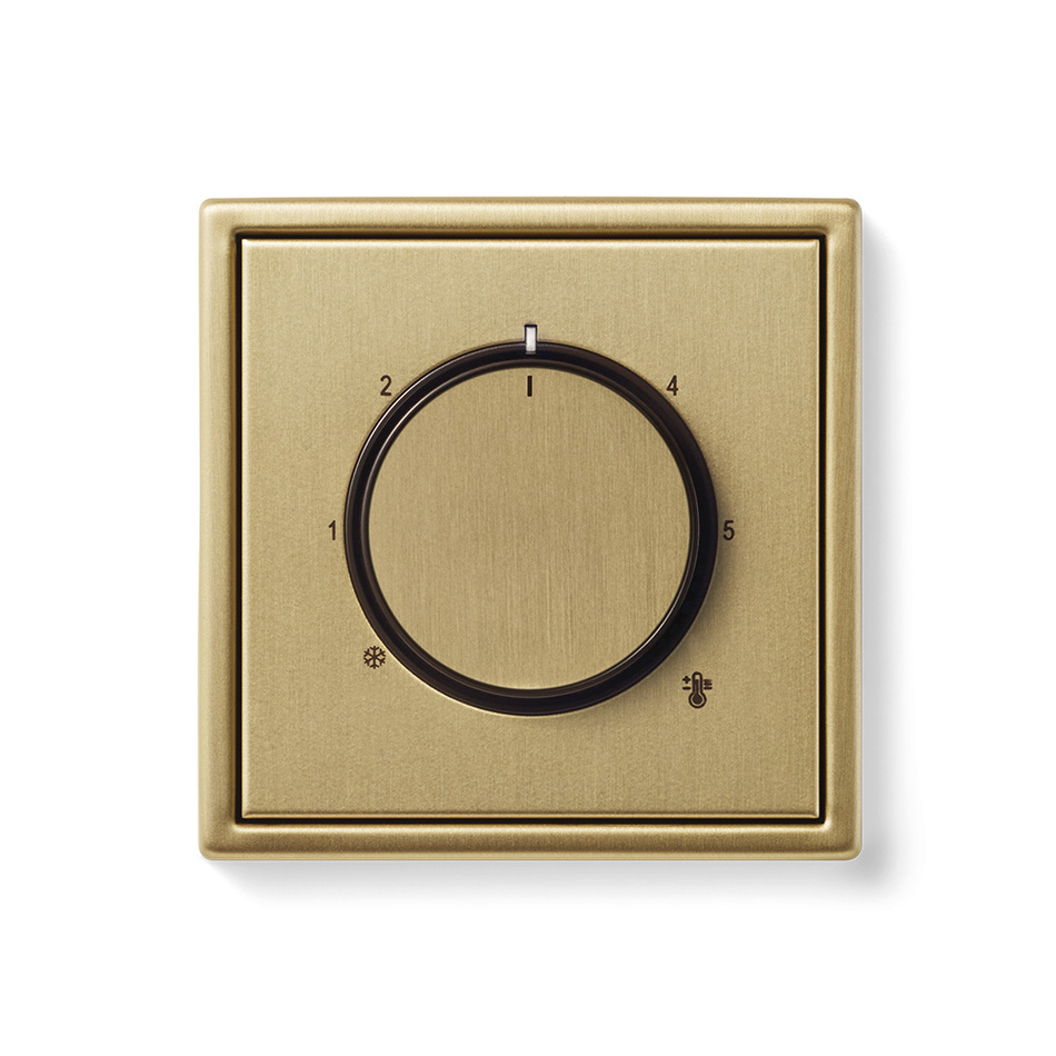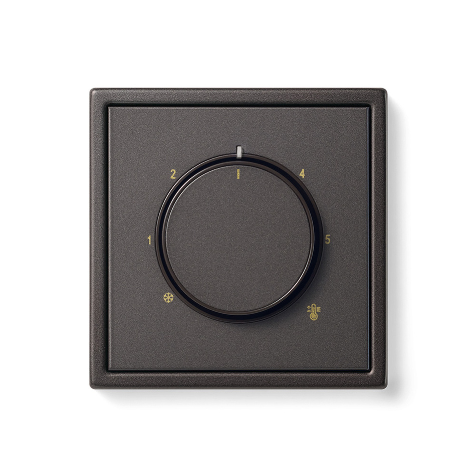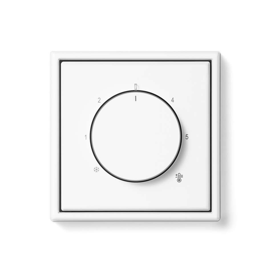 Die Bedienung der Raumthermostate ist verständlich und auf das Wesentliche reduziert: Drehen und drücken – wie bei JUNG Drehdimmern. Mit vier Unterputzeinsätzen für 230 Volt und 24 Volt erweitert JUNG die Funktionsmöglichkeiten bei der Temperaturregelung. Mit dem Design, das insbesondere auf ein größeres Stellrad setzt, hat JUNG zudem die Bedienung einfacher und angenehmer gemacht. Das Stellrad hat einen Durchmesser von 42 Millimeter. Damit sind die Raumthermostate designkonform mit den Drehdimmer-Abdeckungen. Die Symbole auf den Thermostaten sind um das Stellrand angeordnet. Das erleichtert die Ablesbarkeit. Eine LED zeigt den jeweiligen Zustand an. Sie steht leicht hervor, sodass Anwender auch von der Seite den Schaltzustand erkennen: Leuchtet sie rot, läuft die Heizung. Leuchtet sie blau, kühlt die Anlage das Gebäude. Leuchtet sie orange, befindet sich die Heizung im Frostschutzmodus.