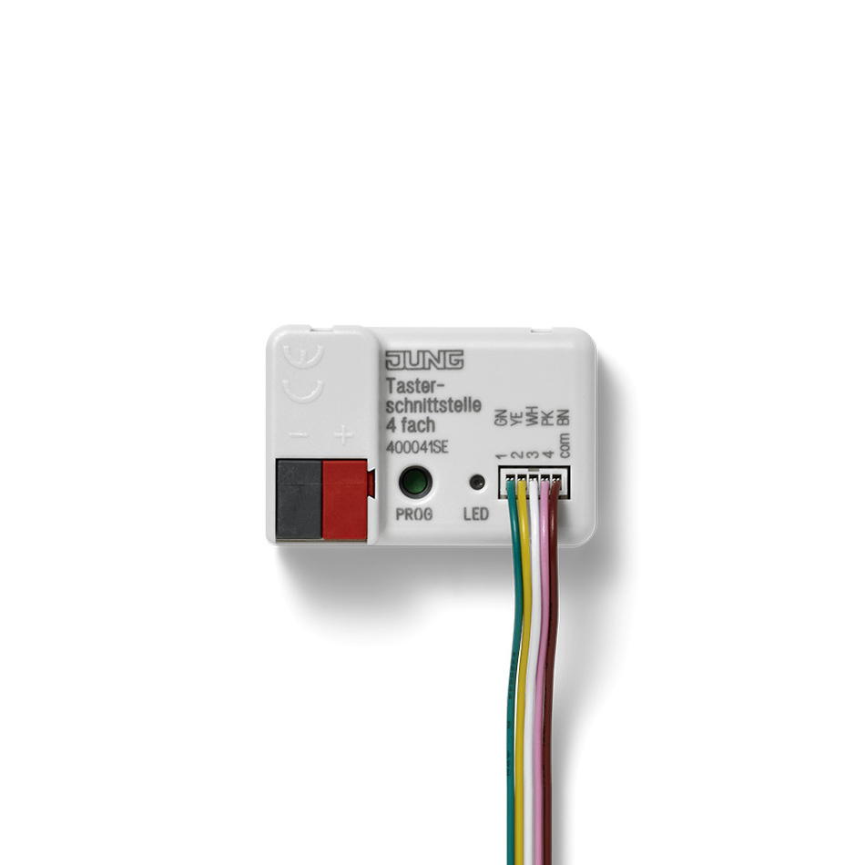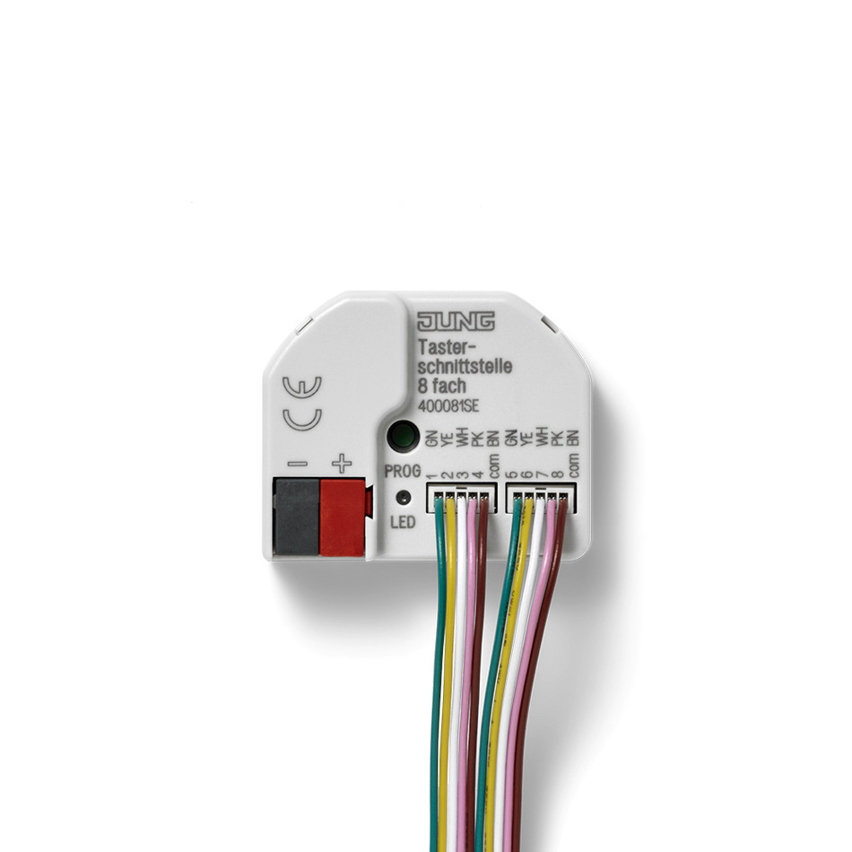 Die KNX Tasterschnittstelle von JUNG erlaubt die nahtlose Integration verschiedener Sensoren und Schalter in ein KNX System. Das ermöglicht eine effizientere und komfortablere Steuerung der Gebäudefunktionen. Taster, Tür-/Fenstersensoren, Hotelcard- oder Schlüsselschalter können über die potentialfreien Kontakte einfach in das KNX System eingebunden werden. Dies ermöglicht eine intelligente Steuerung von Beleuchtung, Heizung, Klimaanlage und anderen elektrischen Geräten. Ein weiterer großer Vorteil der Tasterschnittstelle ist ihre Vielseitigkeit. Sie unterstützt sowohl Leckage- und Betauungssensoren, als auch Temperatursensoren sowie Tür- und Fensterkontakte. Damit können Bauherrinnen und Bauherren die Sicherheit und Energieeffizienz ihres Gebäudes erhöhen. Die Tasterschnittstelle ist in 2-fach, 4-fach und 8-fach erhältlich.