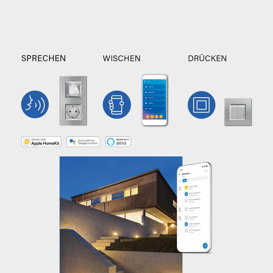 Die Grundlage der funkbasierten Smart Home-Installation stellt das Funk-Gateway dar. Dieses ist entweder innerhalb eines Starterpaketes oder auch in Form des EMDX with Netatmo Funk-Gateway für den Verteilereinbau erhältlich. Das Funk-Gateway verbindet sich mit Ihrem Internetrouter und sorgt dafür, dass Ihre smarten Schalter und Steckdosen untereinander und vor allem mit Ihnen kommunizieren können. Außerdem können Sie Ihre Beleuchtung, Beschattungssysteme und Haushaltsgeräte vor Ort, mit Ihrem Smartphone oder einem Sprachassistenten steuern. So können Sie auch Szenarien festlegen, welche auf bestimmte Situationen wie zum Beispiel das Verlassen des Hauses angepasst sind. Für dieses Szenario könnte beispielsweise eingestellt werden, dass die gesamte Beleuchtung ausgeschaltet und die Rollläden heruntergefahren werden.